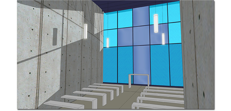 Interior perspective looking towards the grand window / Innenansicht zum Altar und Fenster