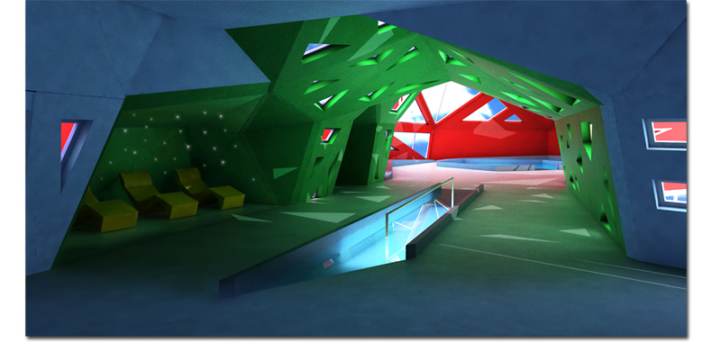 Interior rendering of the Tepidarium towards the Caldarium including a chill-out-box and a Kneipp-basin.