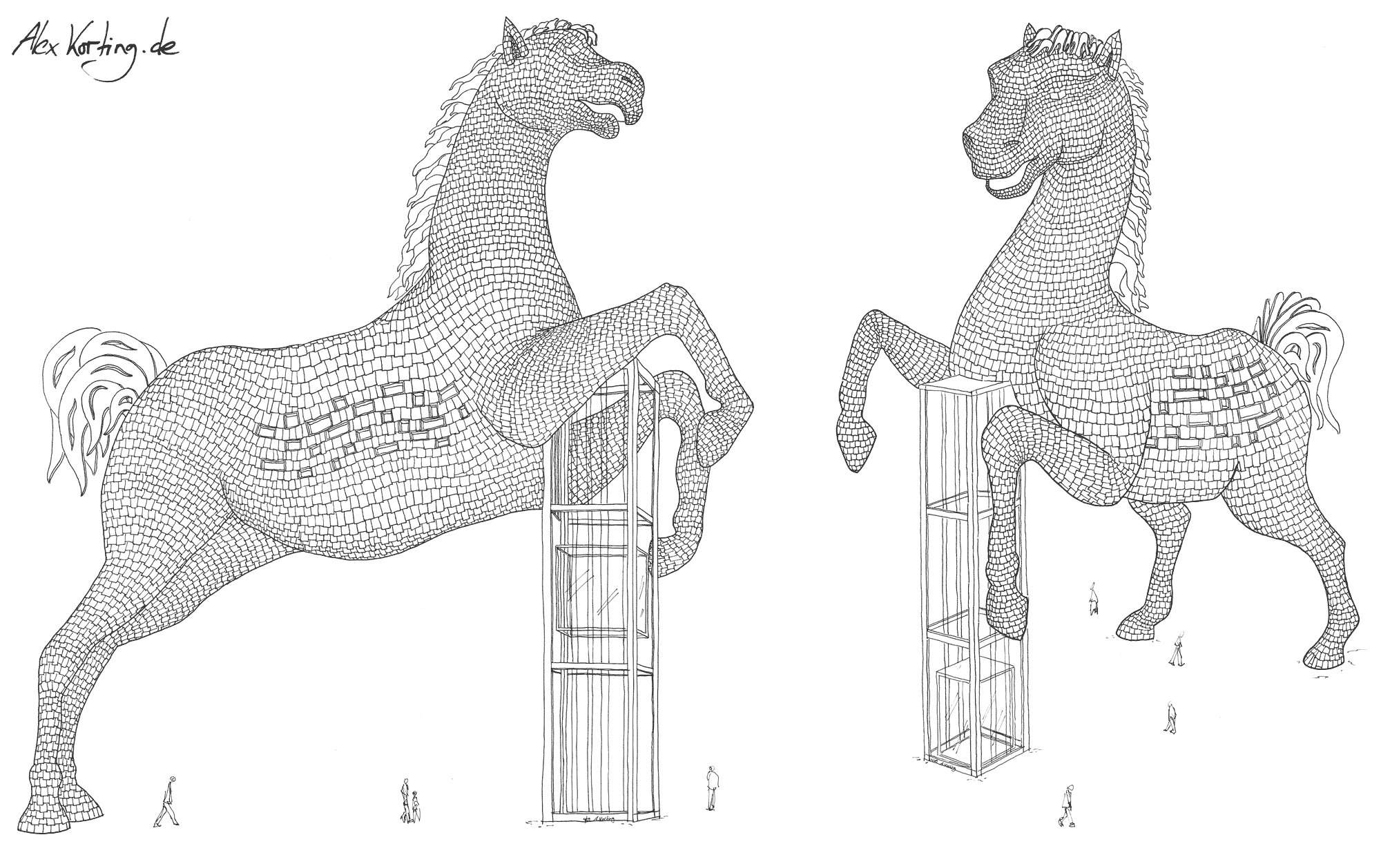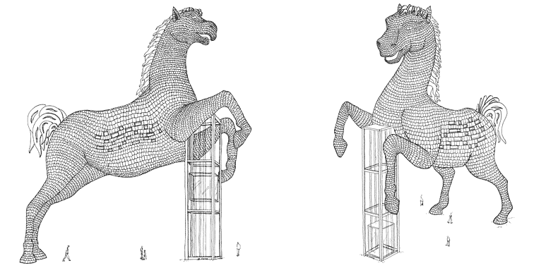 Final drawing of the horse from 2 different perspectives. Height: 33 meters (108 ft.)