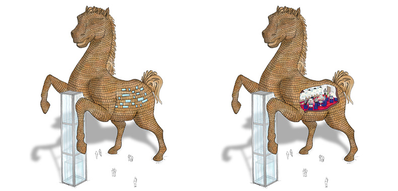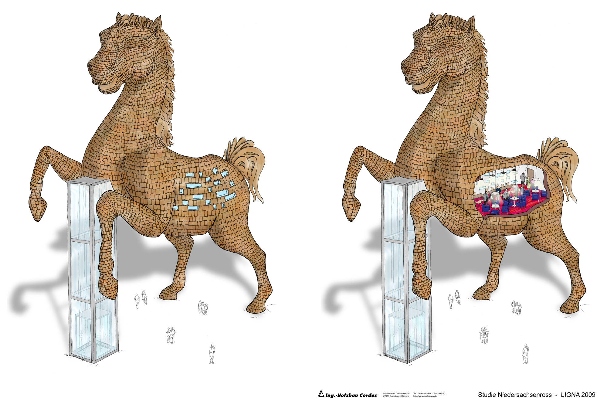 Coloured version with windows (left) and an insight into the meeting room inside the horse (right)