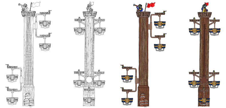 Drawing and coloration of a ship's mast with the colour scheme of an attraction nearby.