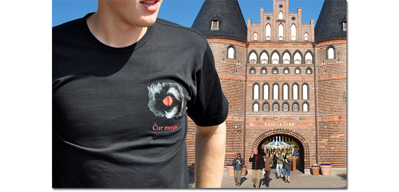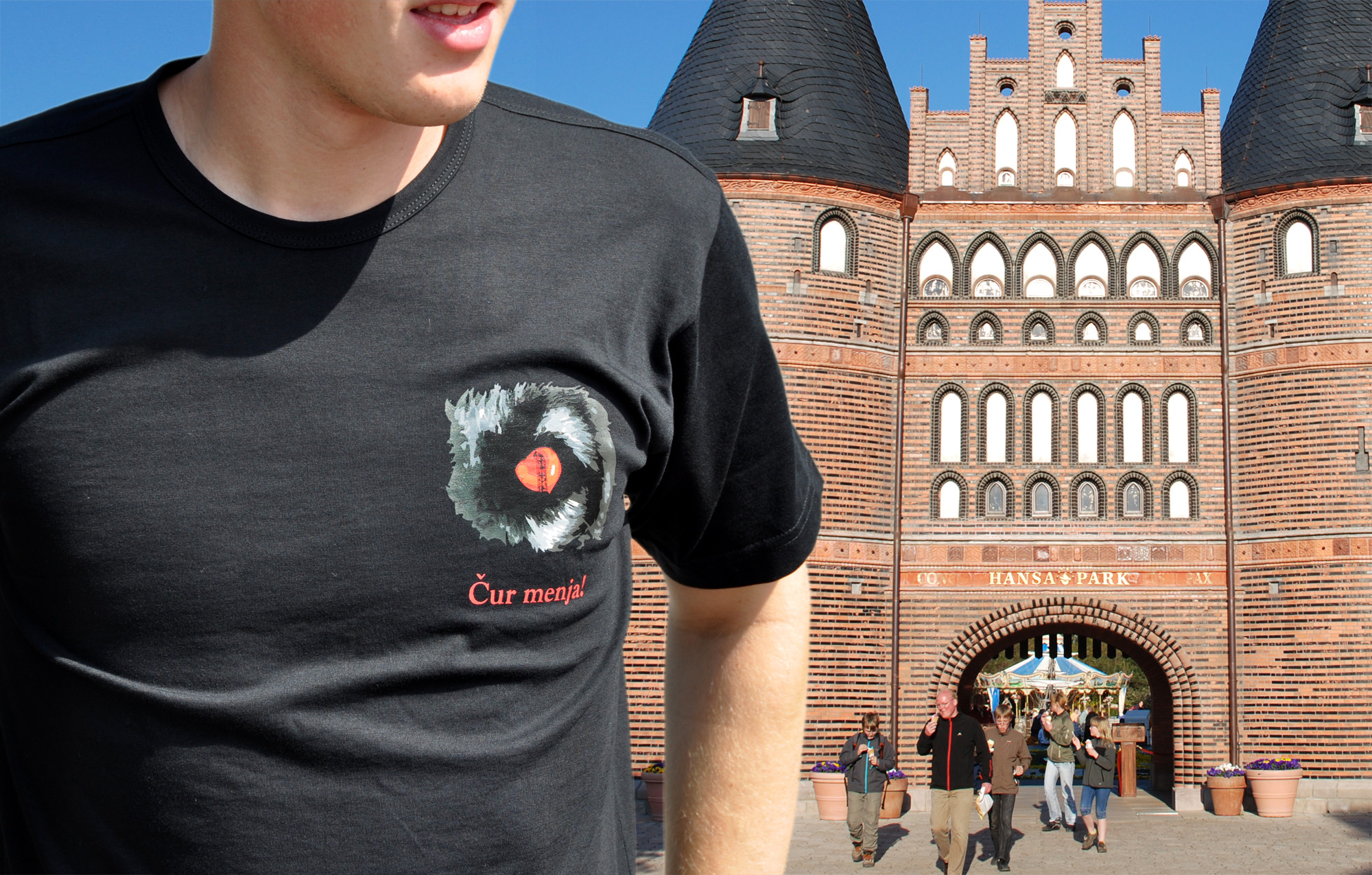 Final design sold on T-shirts and polo shirts inside the park. "Cur menja!" is a Russian charm to protect you from evil.