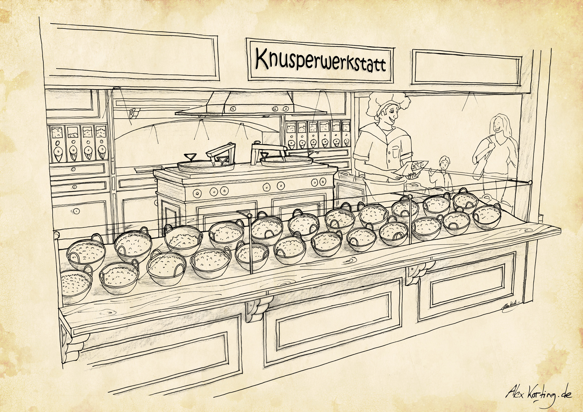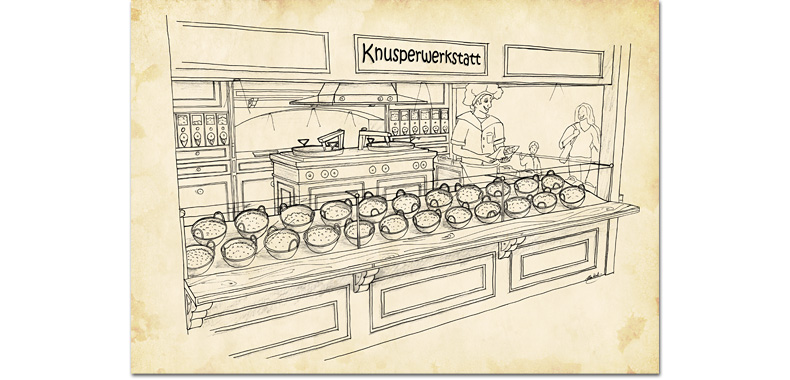 Design and drawings of a special roasted almonds booth for Michael Müller. Front view with roasted almonds in cupper bowls.