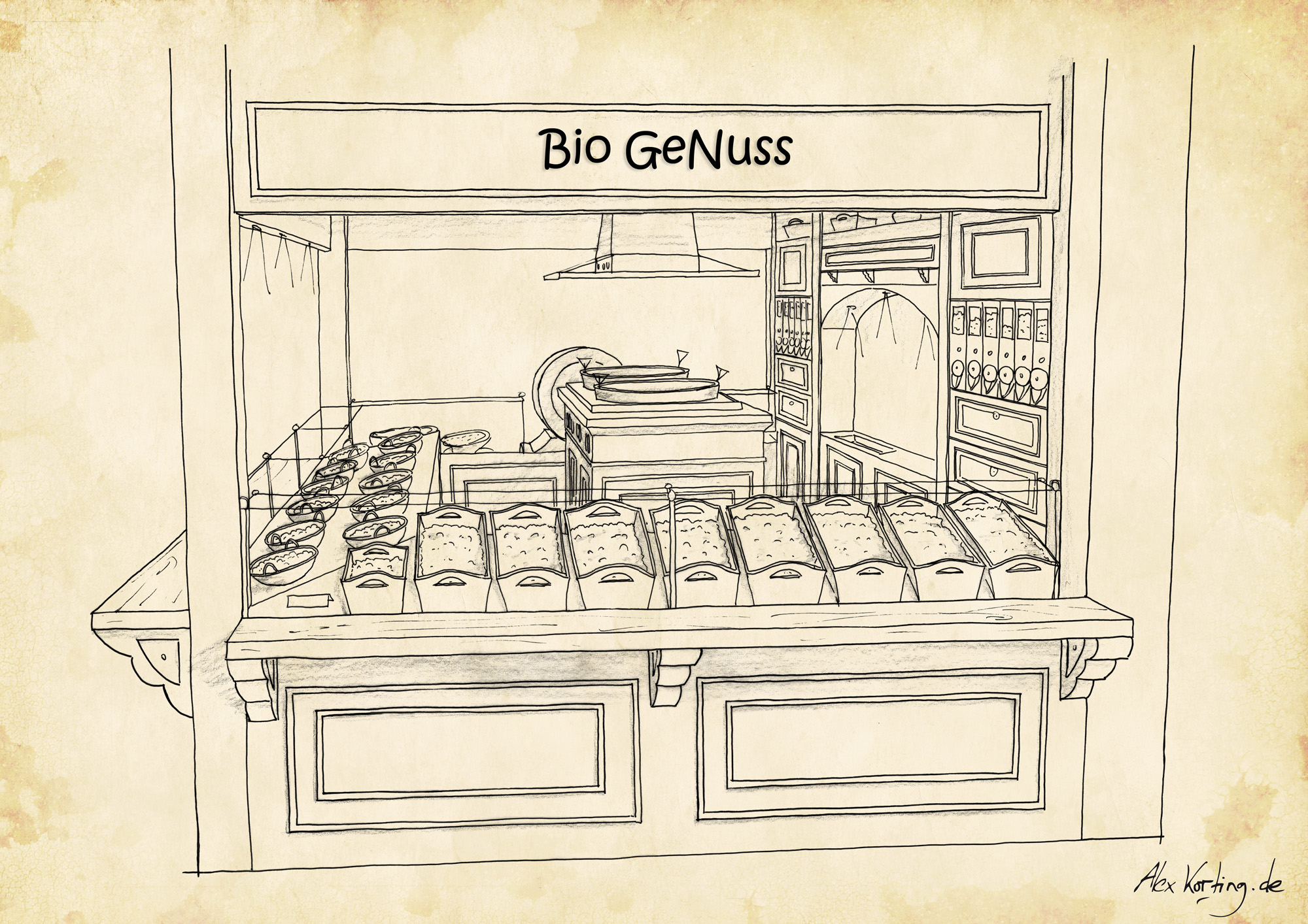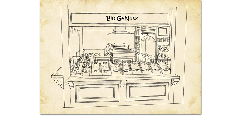 Side view with BIO products in baskets. A special roasting oven is located in the center of the booth.