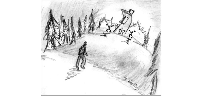 In the end guests find the crashed fuselage burning with scary creatures dancing around it