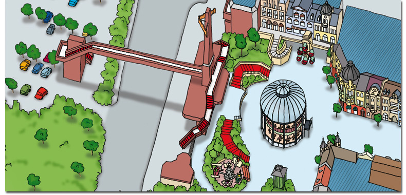The stairs and other obstacles are colored red in the map for wheelchairs & strollers navigation.