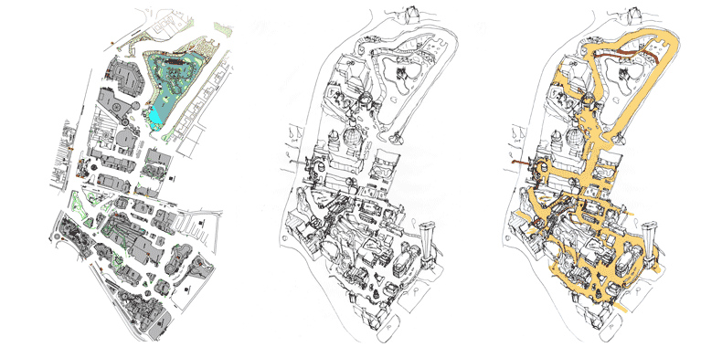First sketches of a new perspective with wider pathways and an optimized view of facades and entrances.