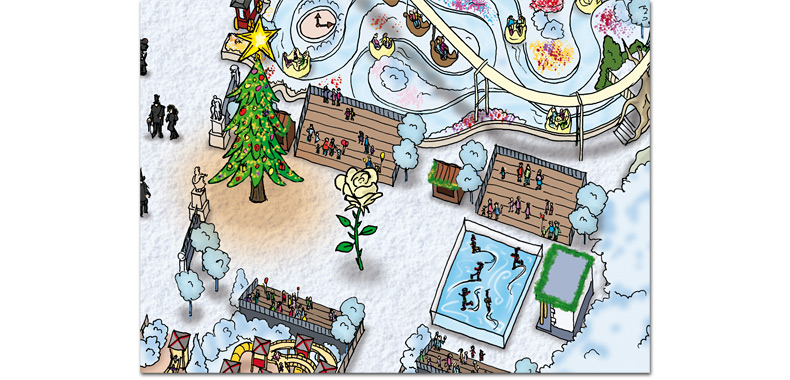 Central plaza with christmas tree, "The magical rose" show and an ice skating rink
