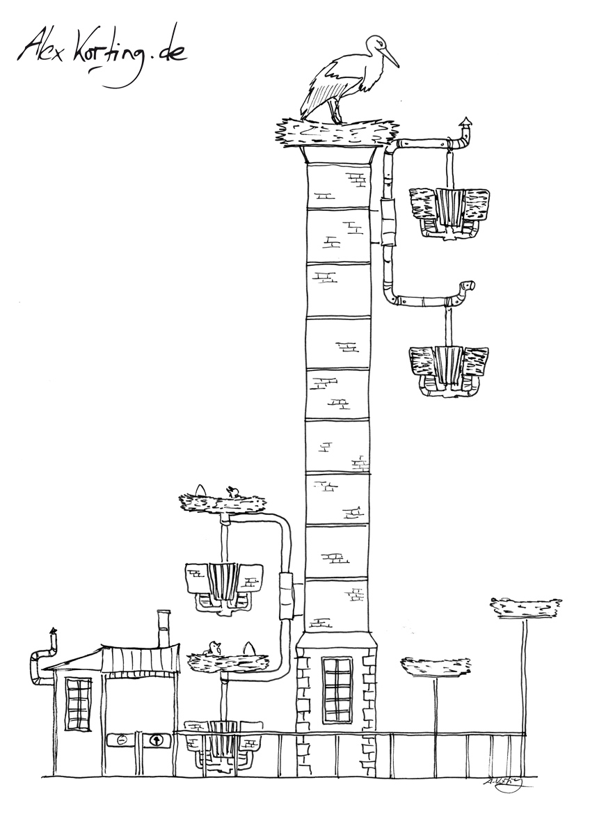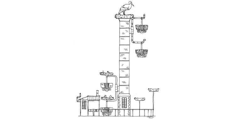 The ride themed as an old industrial chimney with a stork's nest upon it.