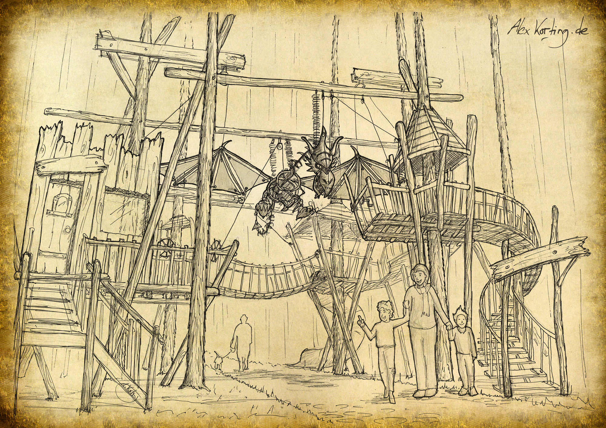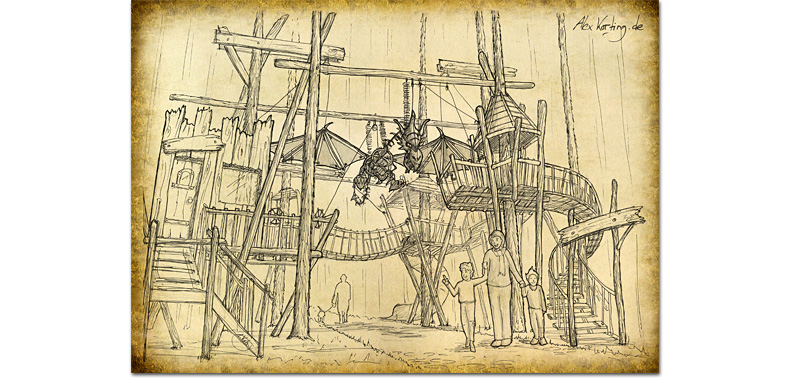 Concept drawing to illustrate the first idea of the dragon above the trail and platforms in the trees to control it from.